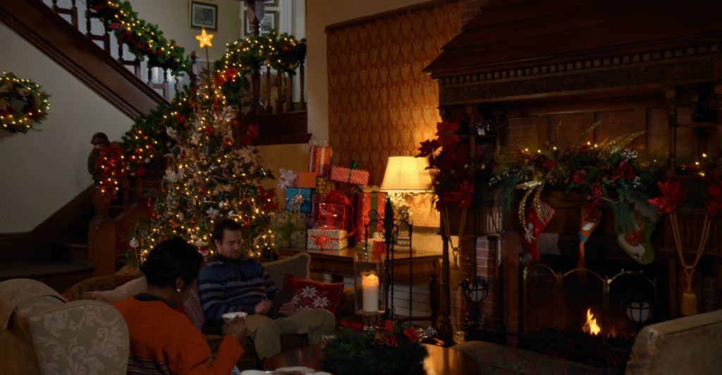 Côté décor, nous sommes superbement bien servis ! Il y en a partout : extérieur de la maison, intérieur de la maison, sur les portes devant et derrière, des sapins dans chaque chambre, des cheminées inombrables, des guirlandes lumineuses, et des plaids rouges, et des assiettes de bisuits, et des pulls de Noël… il y en a PARTOUT ! J’ai adoré. Bien évidemment ! Le maximaliste sera aux anges avec ce film, je pense !